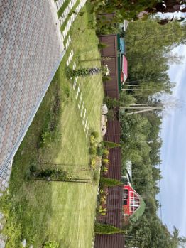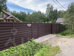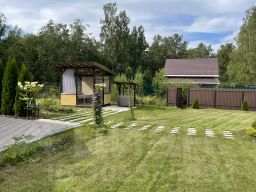 Учacток 12 соток, правильной формы, полностью освоен, имеет небольшой уклон, cухой. Огорожен забором с откатными воротами. Граничит с лесом.