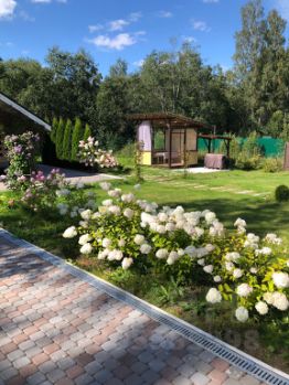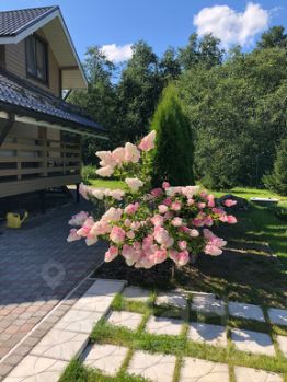 Придомовая территория облагорожена (тротуарная плитка, газон, туи, декоративный кустарник, гортензии).