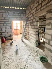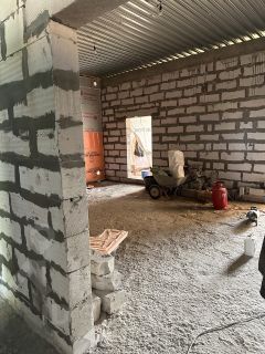 На участке начато строительство одноэтажного дома, площадью 250 кв м, пригодного для круглогодичного проживания. Возведен фундамент: плита из бетона B25 W6 толщиной 300 мм, армированная композитной арматурой. Наружные стены из газобетона D600, B5.0, толщиной 300 мм. Плоская эксплуатируемая кровля, состоящая из монолитной железобетонной плиты толщиной 200 мм, на которой смонтирована армированная стяжка, формирующая уклон в сторону водостока в каждой точке крыши, покрытая несколькими слоями гидроизоляции и утеплителя. Периметр кровли обнесен кирпичным ограждением. Дом остеклен со стороны спален большими окнами от пола до потолка в теплом алюминиевом профиле и окнами поменьше со стороны хозяйственных помещений. Частично возведены внутренние некапитальные стены, проведены техническое освещение и обогрев, предотвращающий промерзание строения зимой.