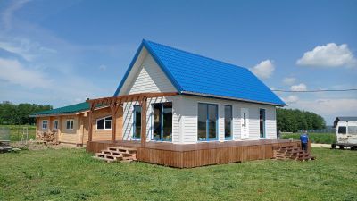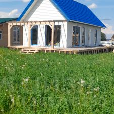 Дом - хороший теплый каркас. Фундамент железобетонные сваи. Пол - SIP-панель 170 мм. Утепление кровли - 250 мм, утепление стен - 200 мм. Внешняя отделка стен - фиброцементные панели. Кровля - металлочерепица. Две веранды: одна открытая , вторая с перголой.