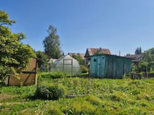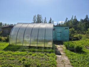 На участке установлена новая теплица (капелька), так же есть сарай, и туалет, посажены многолетние цветы, смородина, яблони.