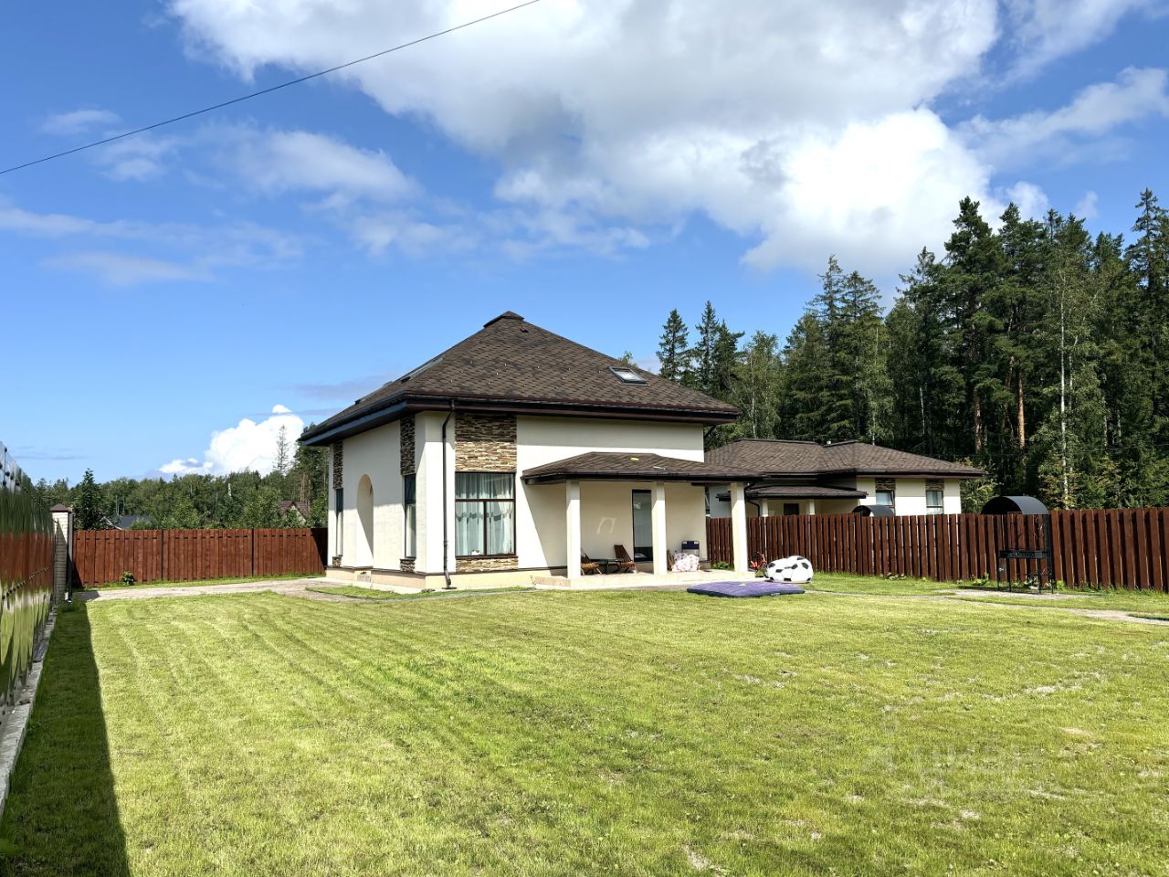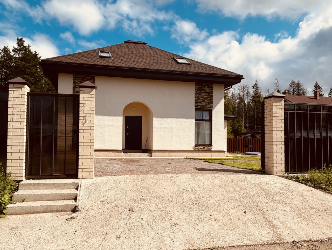 Фасад: Декоративная штукатурка с вставками из натурального камня и панорамными окнами (теплопакеты). Установлена водосточная система и утеплённая отмостка.