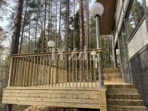 Дом построен по технологии "фахверк" из клееного бруса. Стеновое утепление выполнено из высококачественных материалов. Панорамное остекление - двухкамерные стеклопакеты толщиной 46 мм с теплоудерживающим покрытием.