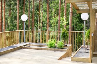 Прямо из холла второго этажа можно подняться по лестнице на эксплуатируемую кровлю. Здесь в окружении плодовых и декоративных растений на просторной открытой террасе могут располагаться кресла и шезлонги, детский бассейн, а под закрытым от дождя и ветра навесом летняя кухня с обеденным столом и местом для приготовления еды.