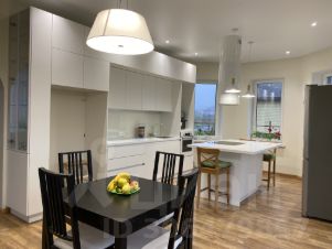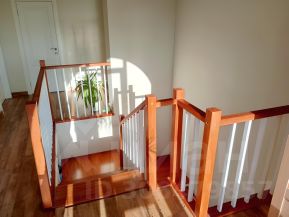 На первом этаже дома теплый пол, просторная гостиная с выходом под камин, кухня-столовая, санузел и бойлерная. На втором этаже радиаторы премиум класса, 3 спальни (одна с гардеробом) и санузел с ванной. Чердак с выдвижной лестницей можно использовать для хранения вещей. Лестница на металлическом каркасе, обшита буком.