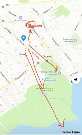 Участок находится в центре Орлино на улице Мира (не путать с СНТ). Подъезд к участку беспроблемный, с асфальтированной дороги, дорога круглогодично обслуживается коммунальными службами, тк по ней ходит рейсовый автобус.