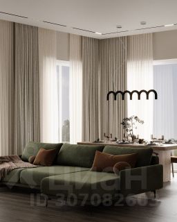 Просторная гостиная с открытой планировкой, объединяющая кухню и обеденную зону.