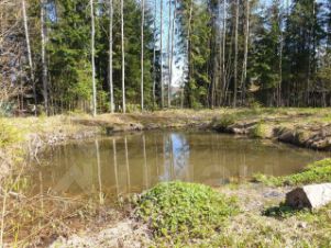 Напротив участка пожарный водоем и зелёная территория.