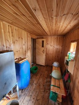 Отдельная баня для отдыха: Просторная двухэтажная баня с комнатой отдыха для идеального расслабления после активного дня. Отдельно стоящие хозпомещения обеспечивают дополнительное место для хранения.
