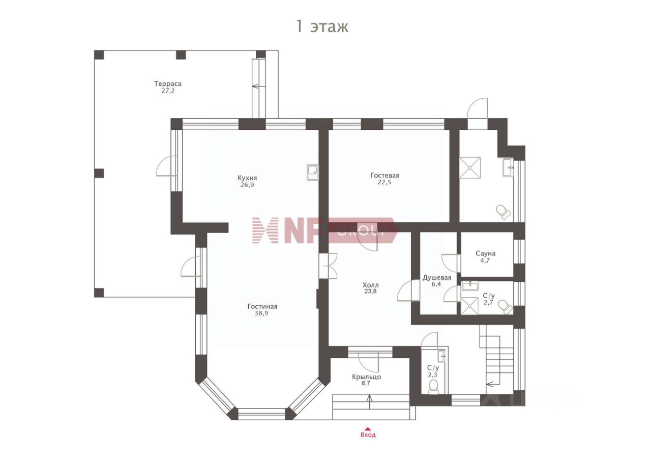 На первом этаже расположены просторный холл, гостиная с камином, кухня с обеденным столом и выходом на террасу, сауна, три санузла и оборудованная котельная.