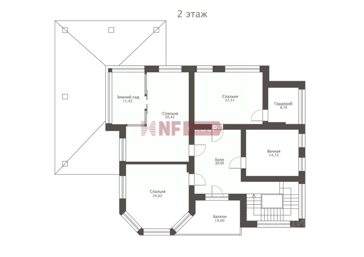 Второй этаж представлен тремя спальнями, ванной комнатой площадью 15 квадратных метров, зимним садом и балконами вдоль периметра дома.