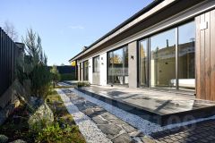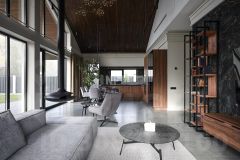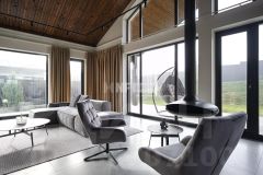 Эстетика внутреннего интерьера гармонирует с внешним ландшафтом, который является продолжением дома благодаря панорамным окнам и воздушным объемам.