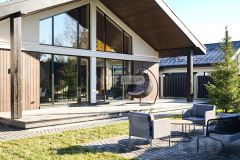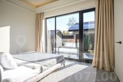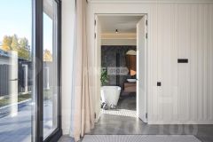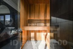 Основная мастер спальня с гардеробной и ванной комнатой с панорамой на участок. Сауна в ванной оборудована финской печью HARVIA, с разогревом за считанные минуты.
