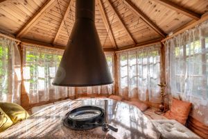 Первый этаж: просторная кухня-столовая, гостиная со вторым светом и финским камином, кабинет, санузел и хозяйственное помещение.. Из гостиной есть выход на две террасы с красивым видом на деревья.