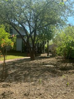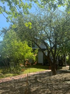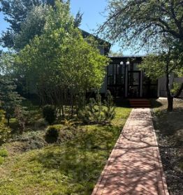 Плодовые деревья и кустарники по всему участку. Парковка под навесом на 2 машины. Хозблок для хранения. Откатные ворота. Участок огорожен металлическим забором.
