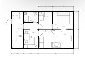 Дом общей площадью 60 м2. На первом этаже большая веранда с летней кухней, ванная комната, кухня, спальня и гостиная с камином.