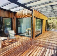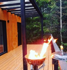 Дом 40 кв.м с большой террасой 55 кв.м и мангальной зоной. В зимний период отапливается тёплыми полами, для летнего периода установлен кондиционер.