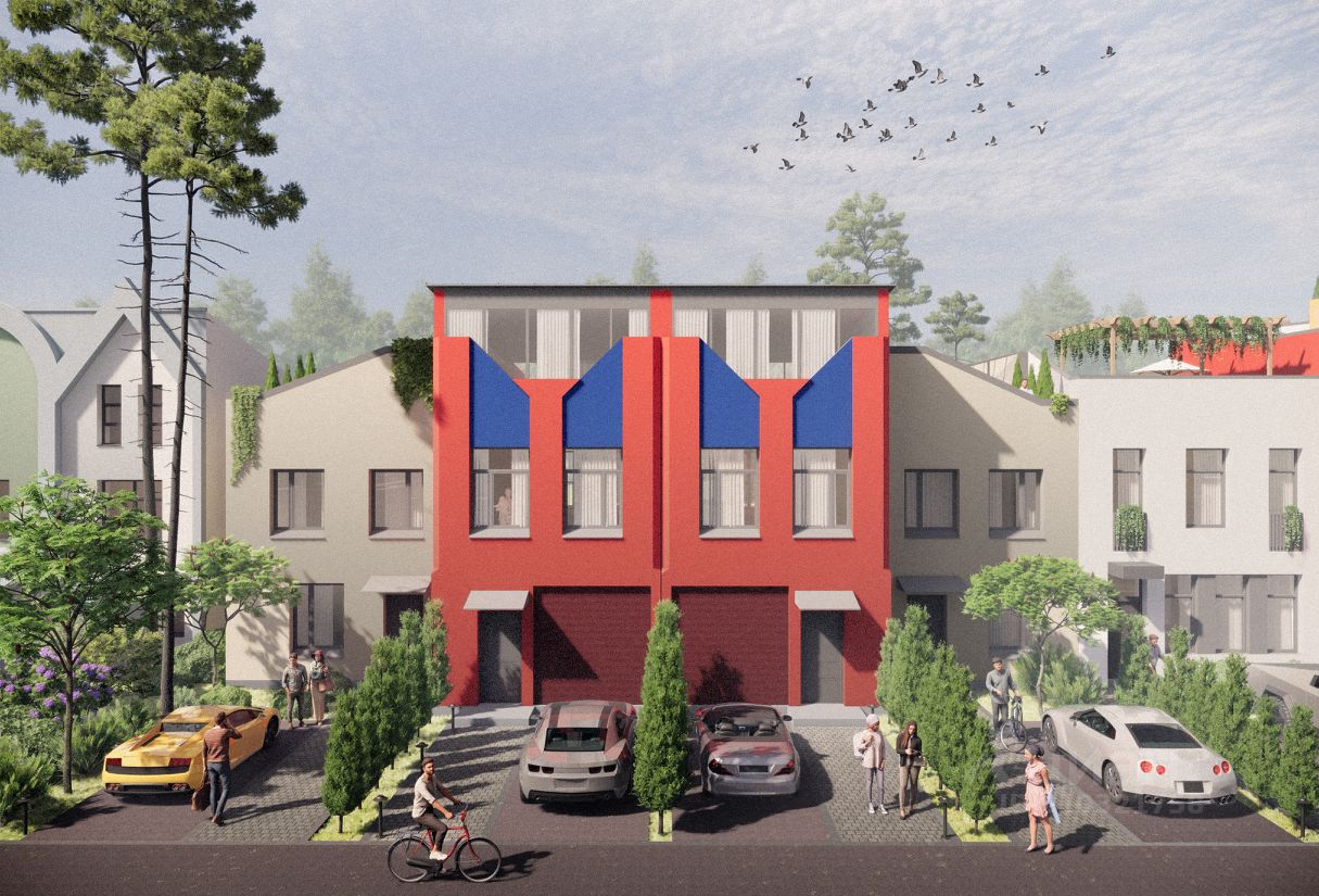 МиносХаус в Прибрежном Квартале выполнен не из камня, как в Греции, а из кирпича. Фасады окрашены в приятные глазу тёплые оттенки: терракота, синий и беж. Выбранные цвета гармонично сочетаются с соседними домами проекта Голландский дворик. Противоположные фасады выходят на живописный лес.