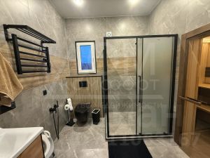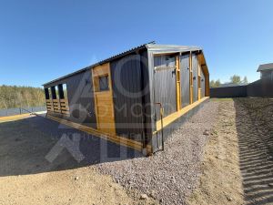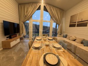Полностью готов, отделка под ключ - матовые натяжные потолки, внутренняя и наружная отделка стен - имитация бруса, полы - керамогранит.