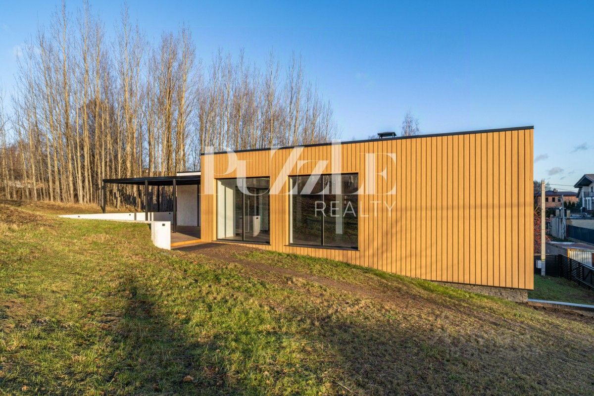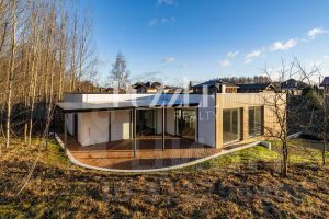 Уникальное архитектурное решение, коттедж вписан в естественный рельеф участка, за счет чего жилая часть дома находится в одном уровне, а со стороны входа расположены крытая парковка для автомобилей (50м2), кладовая, входная гардеробная, постирочное помещение и котельная.