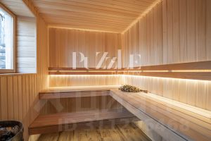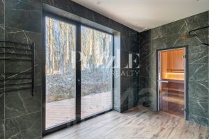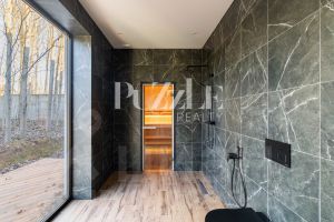 Мастер спальня со своим санузлом, большой гардеробной и сауной, имеет отдельный выход в лесную часть участка, где при желании можно установить купель.