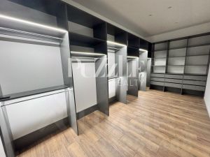 Под гардеробную выделено отдельное вместительное помещение, которое обустроено функциональной открытой системой хранения.