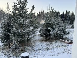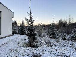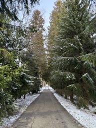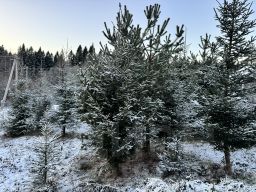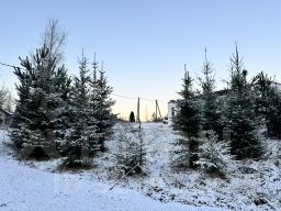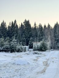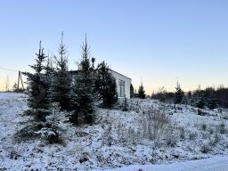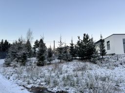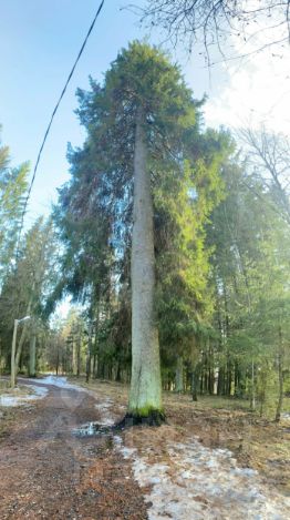 Просторный участок правильной формы с подъездными путями с двух сторон. На участке растут крупные хвойные деревья, создающие атмосферу уюта и гармонии с природой.
