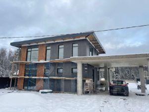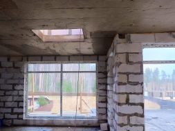 Дом в предчистовой отделке - оштукатурен по маякам и готов к отделочным работам, проложен в плите теплый пол, газ заведен в дом, стоят кровельные окна, в мае ставим котел, затираем плитку на фасаде и подшиваем свесы.