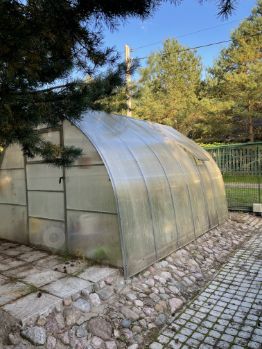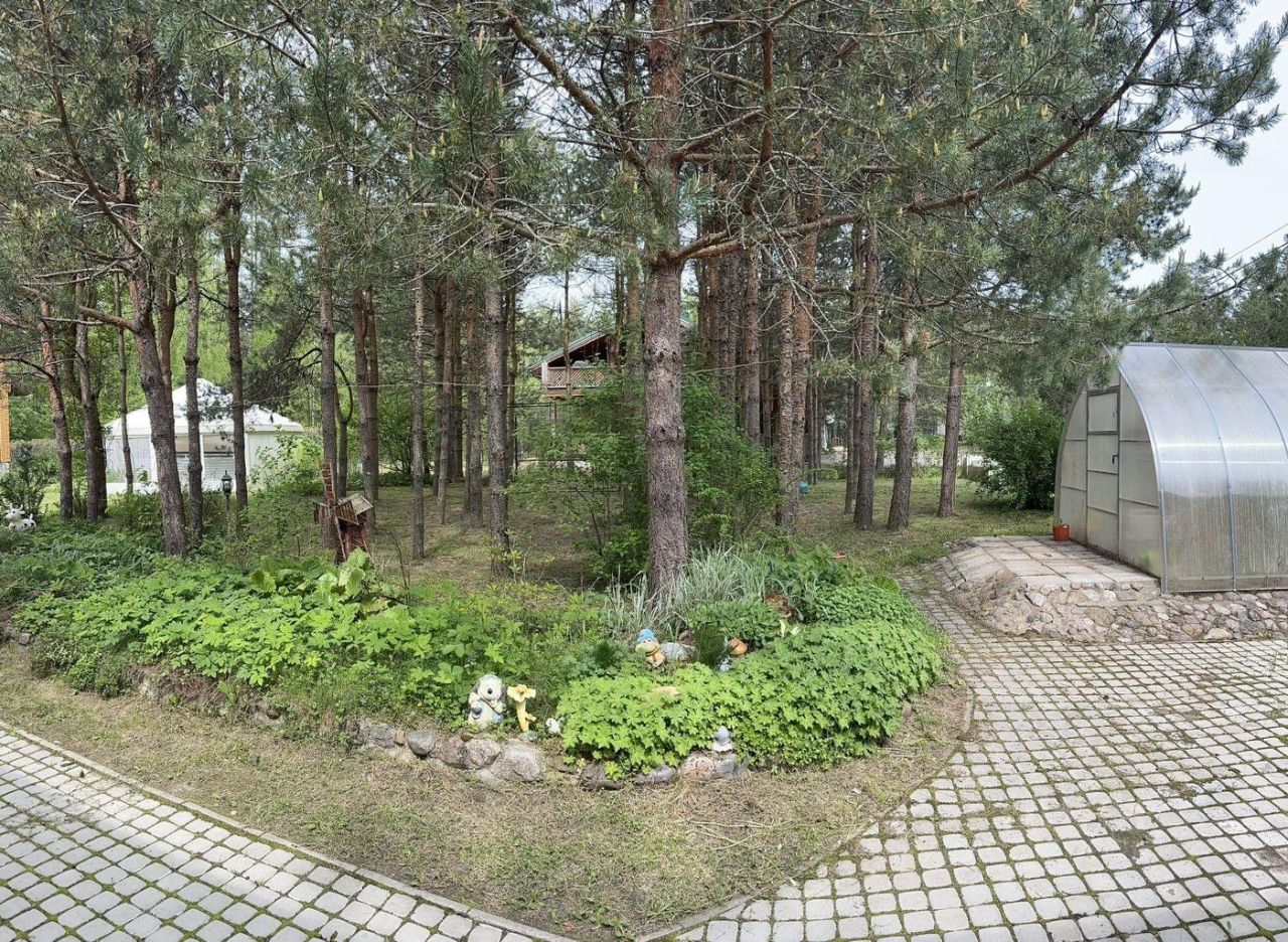 Большой участок, зеленый газон, клумбы, плодовые деревья и кустарники, теплица, детская площадка, батут, бассейн, сосновая зона.