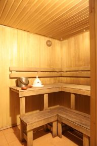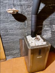Сауна - финская дровяная печь, прогревается быстро, за 15 минут, долго держит тепло.