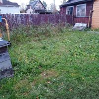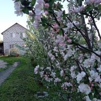 Большой двор, помещается 3-5 автомобилей, хозпостройки, плодовые деревья,цветы, теплица.