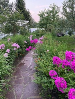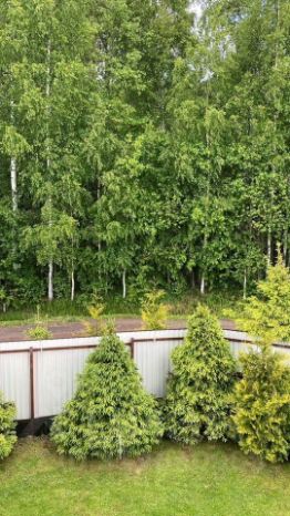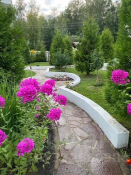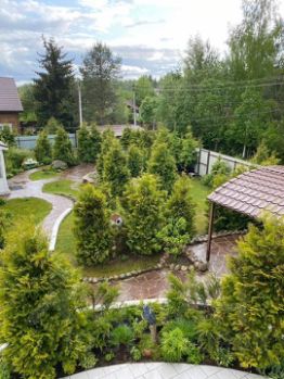 На участке высажены различные породы хвойных, плодовых деревьев и кустарников, сирень, розы.