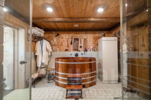 Рядом на свежем воздухе установлена большая джакузи с подогревом, в которой приятно понежиться даже зимой.