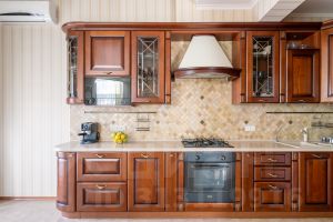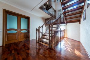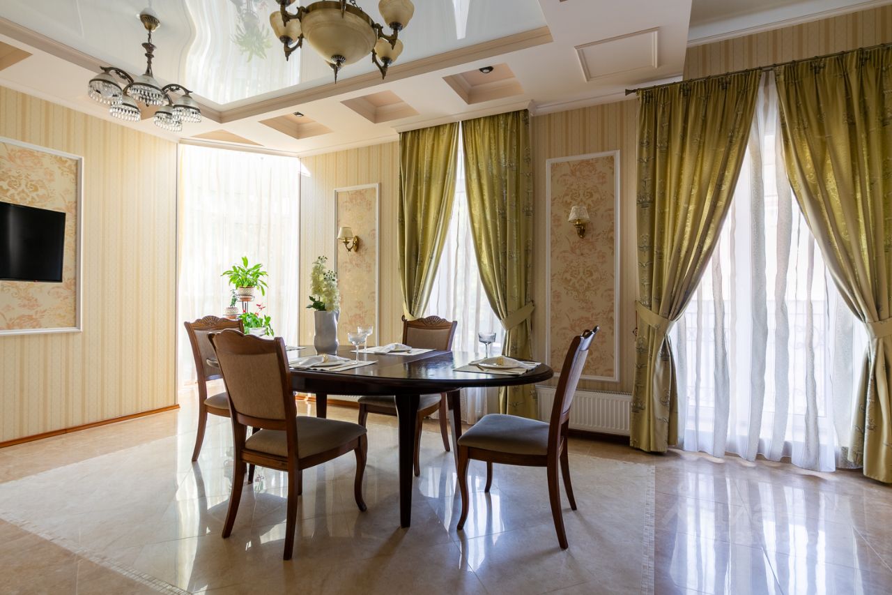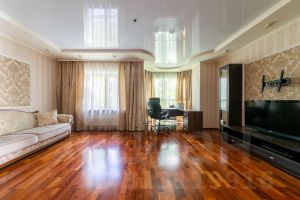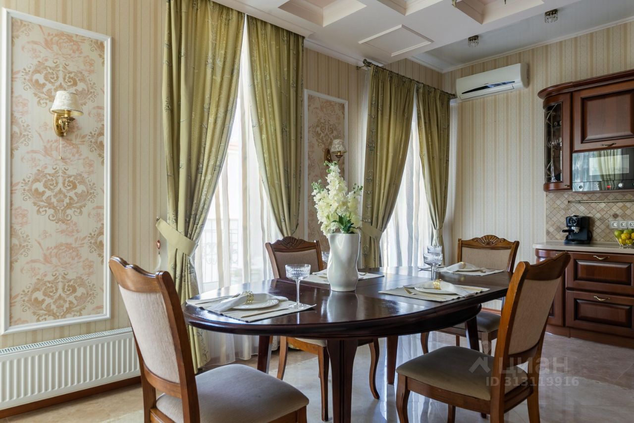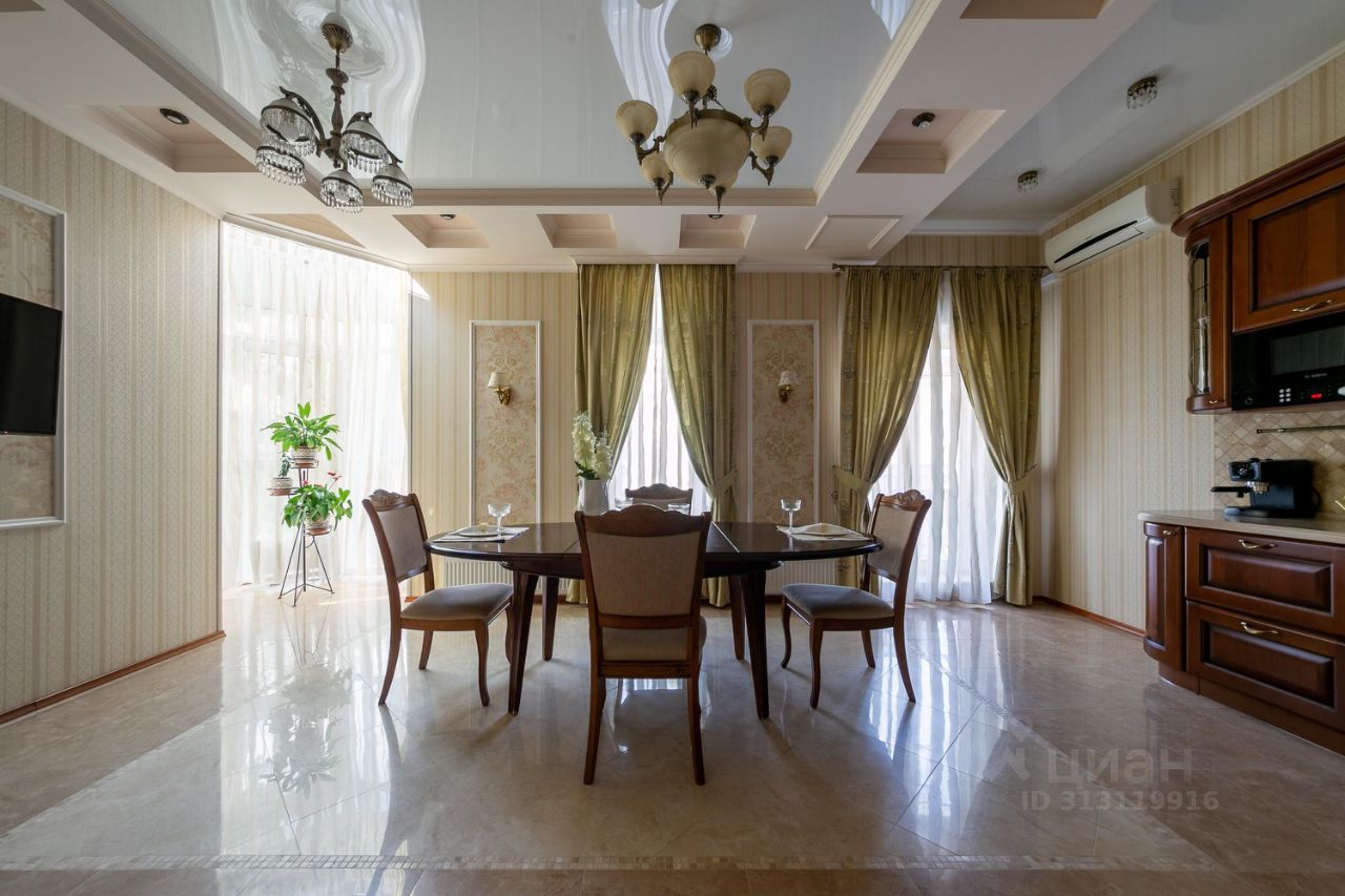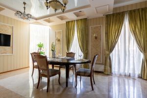 В интерьере использованы дорогостоящие материалы, большинство из которых привезены из Италии, в том числе кухня из массива, керамогранит, обои, шторы.