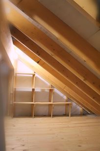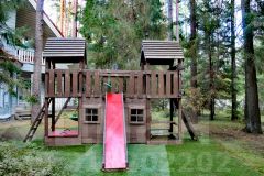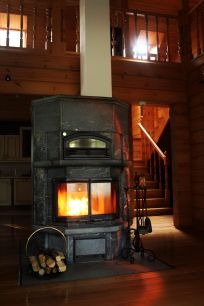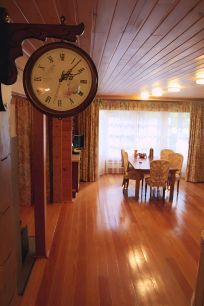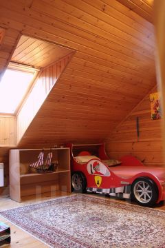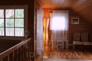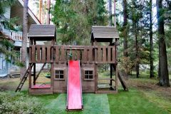 Основной дом деревянный. Имеет три входа/выхода с прилегающей территорией террас. На первом этаже  объединённая большим камином зона кухни и гостиной со вторым светом; спальня, санузел, ванная комната с примыкающей финской сауной. На втором этаже  две спальни и зона отдыха, санузел с душевой кабиной. Есть обустроенный чердак.
