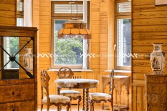 Первый этаж является гостевой зоной и местом сбора семьи: здесь гостинная (50м2), столовая (43,5 м2) и кухня (15м2). Отдельная комната с эркером использовалась ранее как бильярдная (36 м2) - ее размеры позволят ее использовать под любые цели.