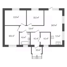 В доме три спальни (10,1 м2, 12 м2 и 10,2 м2), кухня-гостиная (5,5 + 14,9), санузел 4,6 м2, котельная и прихожая.