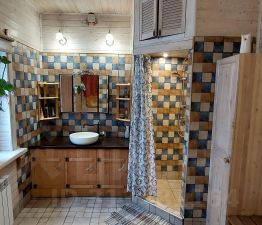1 этаж(117,6 КВ.м) - кухня 15 кв.метров, гостиная 21 кв.м + спальня 18 кв.метров, кабинет- 7 кв.метров, гардеробная - 4 кв.м. Хоз.комната- 8 кв.м.(с раковиной и унитазом). Санузел 7,5 кв.м(душевая кабина, с окном, теплым полом).Пол на этаже - кафель.