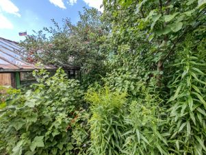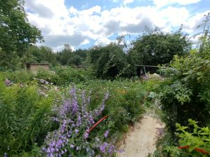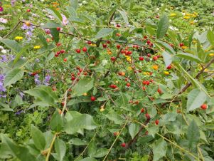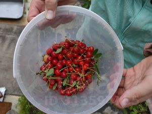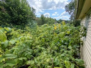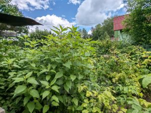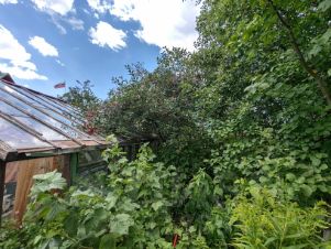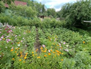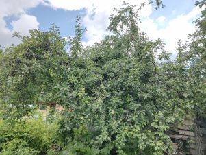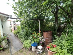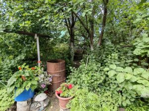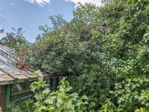 Много плодовых деревьев и кустов: яблони Антоновка, Осеннее полосатое и еще какой-то сорт, сливы, вишни, несколько кустов смородины, крыжовника (белый, красный), очень много малины, клубники.
