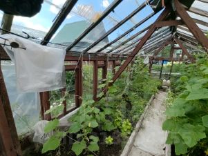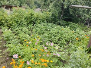 Земля как пух! Возделывалась и удобрялась каждый год. Выращивались овощи: картофель, морковь, капуста, бобовые, лук, чеснок. В теплицах помидоры, огурцы, перцы, зелень и тд. Также растет мята, мелисса.