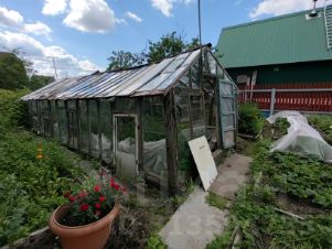 Три стеклянные теплицы с бетонными грядками, которые выступают и фундаментом. Можно разобрать и установить беседку на имеющийся фундамент.