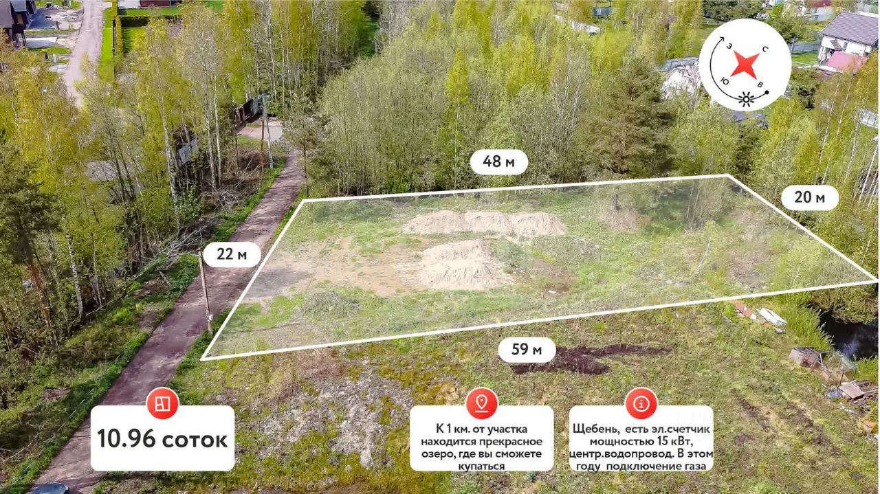 Всего в километре от участка находится прекрасное озеро, где вы сможете купаться и проводить время на свежем воздухе. Участок уже отсыпан и готов к строительству. На территории имеется подключенный электрический счетчик мощностью 15 кВт, а также центральный водопровод, что обеспечит вам комфортные условия для жизни.