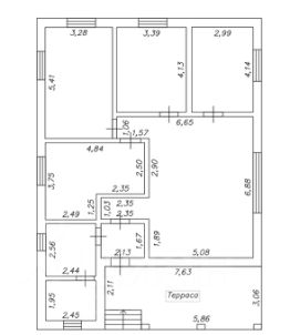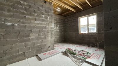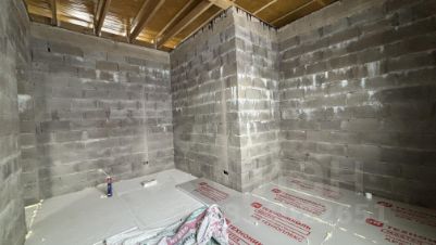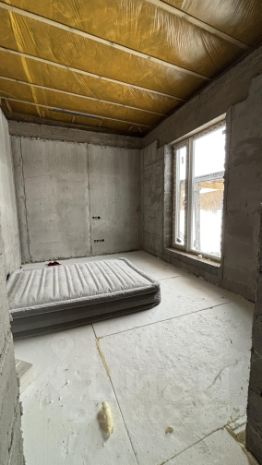 Внутренние стены выровнены и обработаны. Выведены отверстия под электрику, пол готов к стяжке.