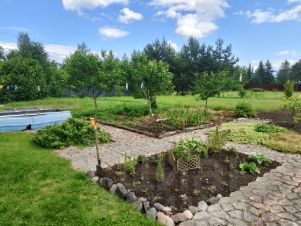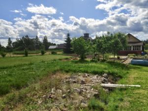 Участок использовался для выращивания картофеля в течение 30 лет (земля удобренная), растут и уже плодоносят яблони, сливы и вишни - всего около 10 деревьев, несколько кустов малины посажены в 2024г. Участок огорожен с одной стороны (лицевой) забором, с боковой стороны расположен хозблок. От соседнего участка ограничен взрослыми соснами.