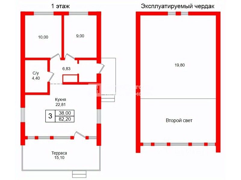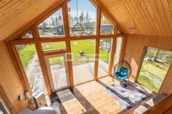 1 этаж: кухня-гостиная 22.8 м2 с вторым светом (потолок 4.8 м) и с панорамным остеклением, две раздельные спальни 10 и 9 м; санузел; терраса 15 м2.