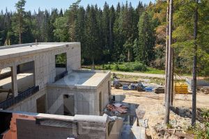 Фундамент дома - монолитная железобетонная теплоизолированная плита (марка бетона В30) с заложенными коммуникациями, контуром заземления, дренажной системой и каналами для прокладки кабелей освещения прилегающей к дому территории. Прозрачные стены первого и второго этажей выполнены из двухкамерных стеклопакетов, заполненных аргоном в алюминиевых рамах. Внутреннее стекло закаленное, селективное, центральное F-стекло, внешнее закаленное, солнцезащитное. Глухие стены сделаны из газобетона толщиной 400 мм. Крыша монолитная с наплавляемой кровлей.