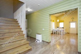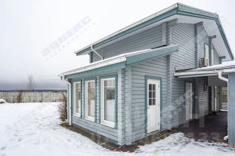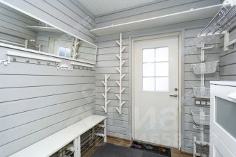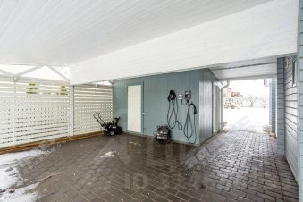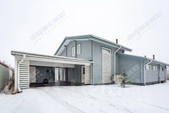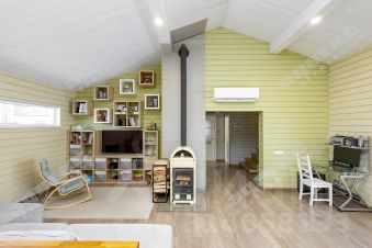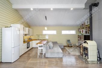 При въезде на участок, навес примыкает к дому и обеспечивает комфортный вход в дом в любую погоду. Сам дом начинается с оборудованной прихожей, где могут на 3-5 человек раздеться одновременно. Далее, холл с лестницей на 2 этаж и проход в зал-гостиную-кухню (45 кв м) с итальянским камином и высоким потолком под конек крыши. Красивый и функциональный дизайн в скандинавском стиле единый во всем интерьере дома. Зона отдыха, большой стол, кухня более 12 погонных метров. Из гостиной второй выход из дома, выходящий на террасу, к бане и внутреннему пространству участка. Баня примыкает к дому и выходит на единую с ним террасу.
