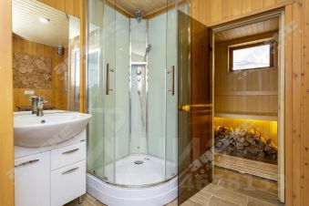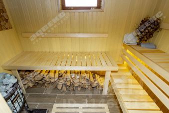 Баня: ярусная парилка 2,2мХ1,5м, печь обложена камнями жадеит колотый, можжевеловые панно пахнут, отделка осина. В предбаннике душевая кабина, раковина.