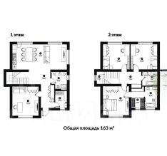 Планировочные решения коттеджа состоят: на первом этаже из помещения прихожей, санузла, гостиной совмещенной с кухонной зоной, спальной и котельной. На втором этаже находятся 3 спальни, одна из которых является мастер-спальней со своим санузлом и гардеробной и еще один санузел.