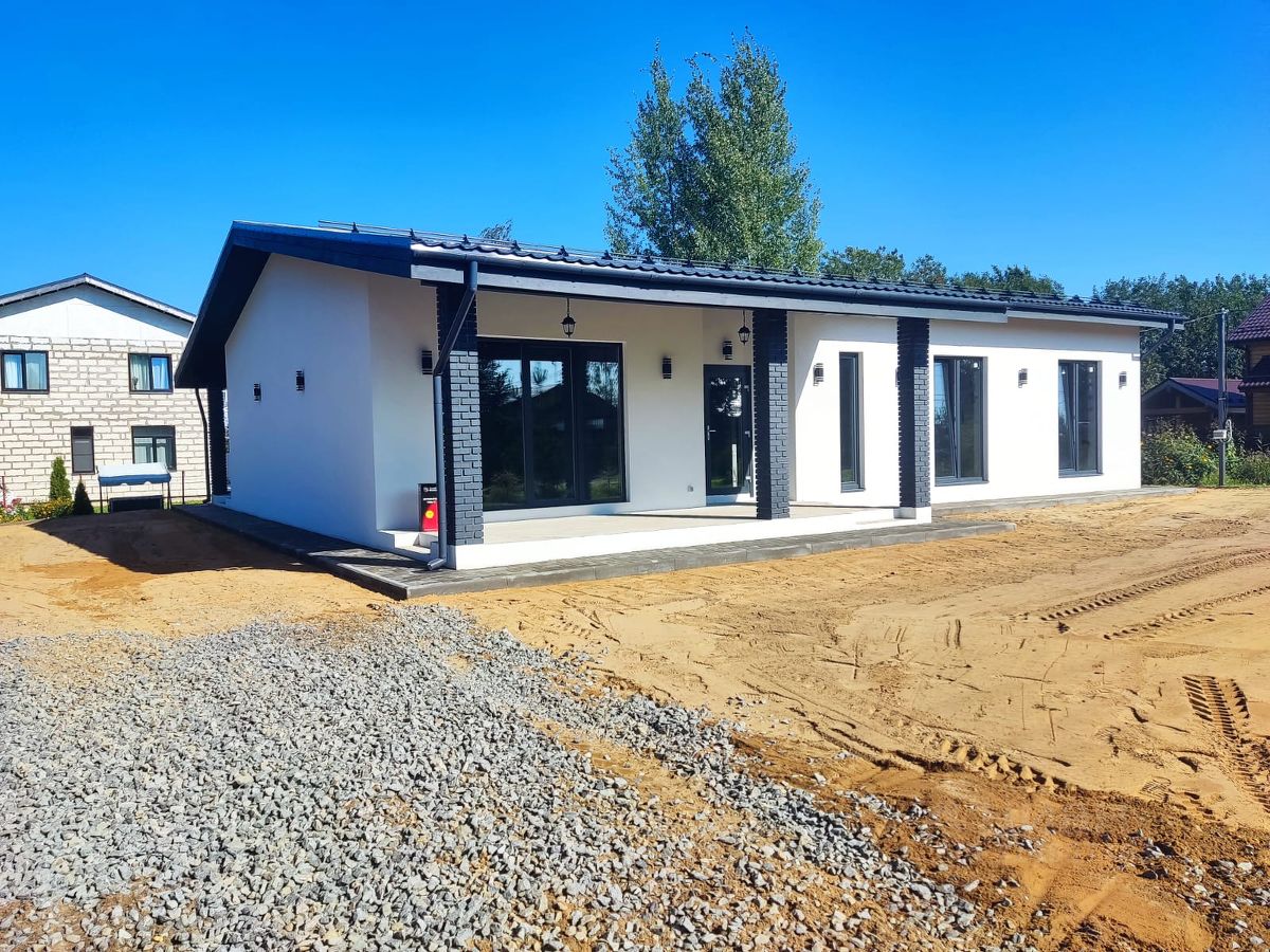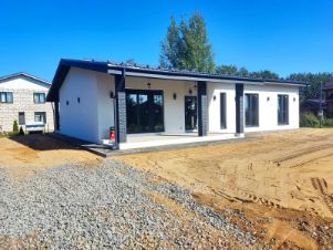 Продается стильный одноэтажный коттедж с продуманной планировкой. Дом выполнен из газобетона, с утеплением 150 мм и штукатуркой на бетонной плите, высотой 350 мм по технологии УПШ. Крыша из металлочерепицы со снегозадержателями по всей длине крыши. Установлены качественные стеклопакеты, по фасадной части дома и в гостиной панорамные окна в пол. Проектом предусмотрены две террасы с двух сторон дома под единой крышей с домом.